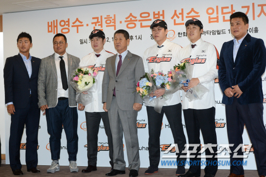 이들은 11일 대전 한화갤러리아 타임월드 12층 스카이홀에서 공식 입단식을 열고 한화, 그리고 김성근 감독과 함께 하게 된 소감을 밝혔다. 이에 앞서 김 감독은 "식구가 세 명 늘어서인지 부자가 된 것 같다"면서 "한화의 내년 목표는 우승이다. 여기 있는 세 명은 모두 우승한 경험이 있어서 큰 도움이 될 것이라고 본다. 전체적으로 투수진 운용에 큰 여유가 생겼다"고 평가했다.