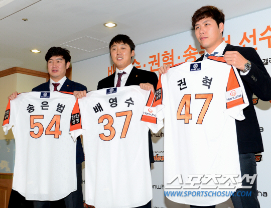 한화 이글스 김성근 감독은 말을 돌려하지 않는다. 딱 부러지게 말했다. "내년 목표는 우승이다". 그러면서 목표 달성을 향한 강력한 추진력이 생긴 것을 대단히 만족스러워했다. "부자된 것 같네"라며 환하게 웃었다. 김 감독에게 '부자'의 만족감을 안겨준 '한화 우승의 추진력'은 바로 세 명의 FA 영입 선수들이다. 배영수, 송은범, 권 혁이 공식 입단식을 갖고 '한화맨'이 됐다.