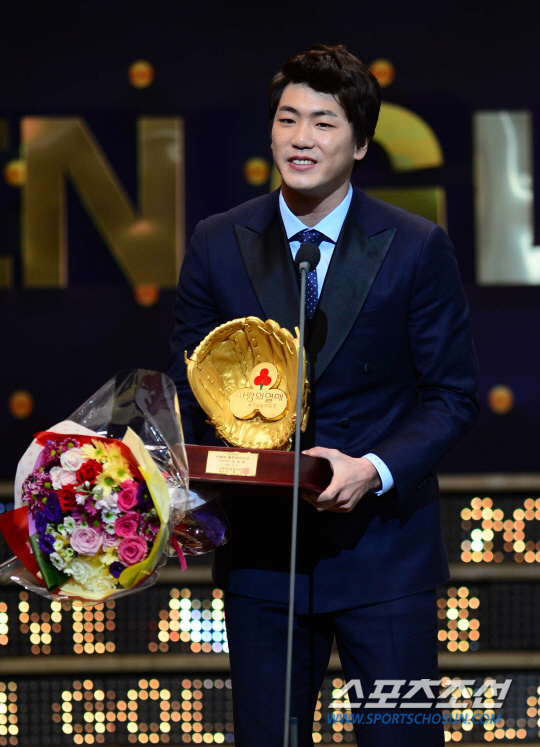 올 시즌 프로야구 포지션별 최고의 선수를 선정하여 시상하는 '2014 프로야구 골든글러브 시상식'이 9일 오후 서울 삼성동 코엑스 오디토리움에서 열렸다. 시상식에서 사랑의 골든글러브상을 받은 SK 김광현이 소감을 밝히고 있다. 김경민 기자 kyungmin@sportschosun.com / 2014.12.09.