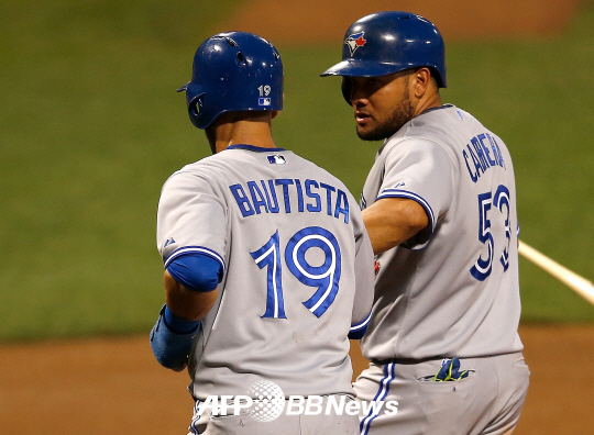 | 시카고 화이트삭스가 FA 외야수 멜키 카브레라를 영입해 외야진을 보강했다. 토론토 블루제이스 시절인 지난 9월 6일(한국시각) 보스턴 레드삭스전에서 호세 바티스타와 득점을 올리고 있는 카브레라. ⓒAFPBBNews = News1 |