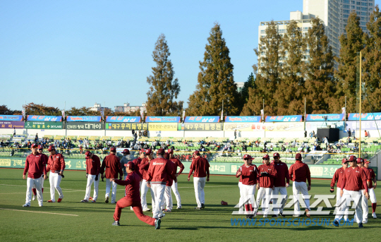 4일 대구구장에서 삼성과 넥센의 2014 프로야구 한국시리즈 1차전 경기가 펼쳐질 예정인 가운데 넥센 선수들이 워밍업을 하고 있다. 대구=허상욱 기자 wook@sportschosun.com/2014.11.04/ |