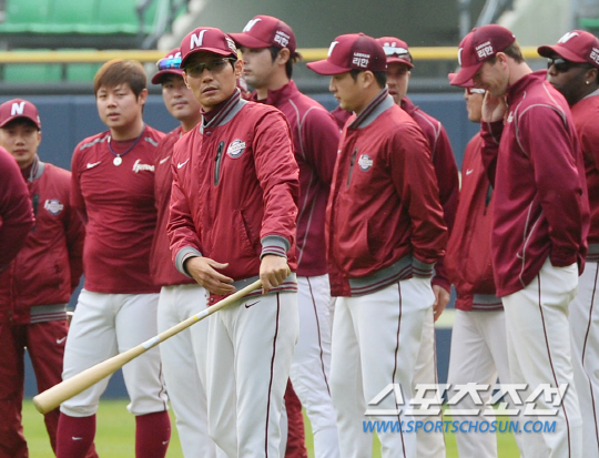 삼성 라이온즈와 넥센 히어로즈의 2014 프로야구 한국시리즈 6차전이 11일 서울 잠실구장에서 열린다. 전날 경기에서 충격적인 역전패를 당한 넥센 선수들이 경기장에 나와 훈련을 시작하고 있다. 염경엽 감독이 선수들을 모으고 있는 모습. 잠실=정재근 기자 cjg@sportschosun.com/2014.11.11/