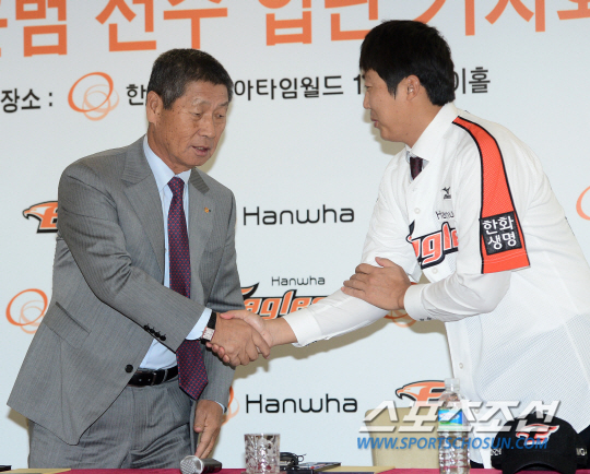 한화로 이적한 배영수, 권혁, 송은범의 입단식이 11일 대전 한화갤러리아타임월드 스카이홀에서 열렸다. 김성근 감독이 기자회견을 마친 후 선수들과 일일이 악수를 나누고 있다. 한화는 FA 투수 배영수와 3년간 총액 21억 5천만원, 송은범과 4년간 총액 34억원, 권혁과 4년간 총액 32억원에 계약을 체결했다. 대전=정재근 기자 cjg@sportschosun.com/2014.12.11/
