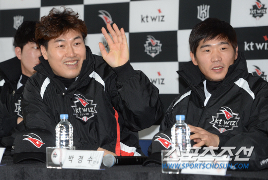 프로야구 제10구단 KT 위즈가 프로야구 개막 D-100일을 맞아 신규 입단 선수(김사율 김상현 박경수 박기혁 배병옥 장시환 장성호 정대현 정현 용덕한 이대형 윤근영 이성민) 기자회견을 가졌다. 수원=허상욱 기자 wook@sportschosun.com/2014.12.18/ |