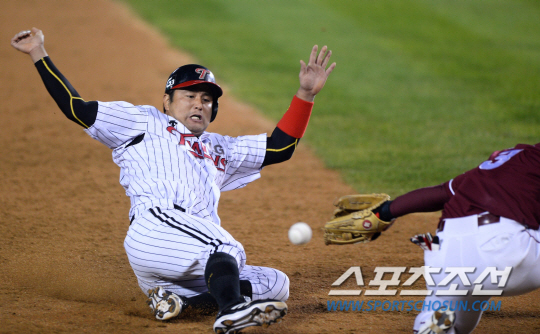30일 잠실구장에서 2014 프로야구 플레이오프 3차전 LG 트윈스와 넥센 히어로즈의 경기가 열렸다. LG-넥센은 시리즈 1승 1패를 기록 중이다. LG 리오단과 넥센 오재영이 선발 맞대결을 펼쳤다. LG 5회 1사 만루에서 정성훈의 외야 플라이 타구 때 2루주자 최경철이 3루까지 달려 세이프 되고 있다. 잠실=송정헌 기자 songs@sportschosun.com/2014.10.30