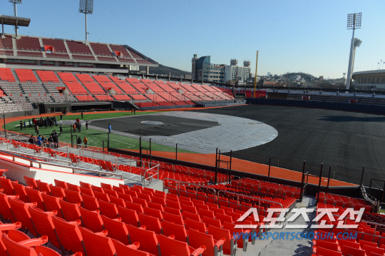 프로야구 제10구단 KT 위즈가 프로야구 개막 D-100일을 맞아 신규 입단 선수(김사율 김상현 박경수 박기혁 배병옥 장시환 장성호 정대현 정현 용덕한 이대형 윤근영 이성민) 기자회견을 가졌다. 공사가 진행중인 수원구장의 모습 수원=허상욱 기자 wook@sportschosun.com/2014.12.18/