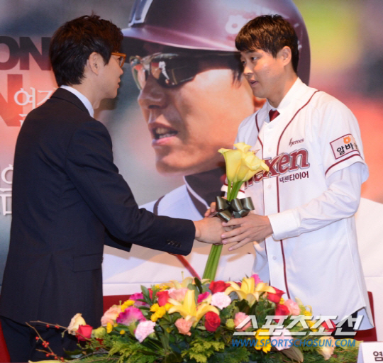 염경엽감독이 프로야구 넥센 히어로즈의 제3대 사령탑으로 공식 취임했다.염경엽 신임감독은 18일 오후 목동야구장에서 열린 신임 감독 취임식을 겸한 1군 코칭스태프 발표 기자회견에서 '2013 시즌'의 새로운 출발을 알렸다.KIA에서 투수코치로 활동한 이강철(46) 코치가 새 수석코치로 선임돼 염경엽 감독을 보좌하며 한화에서 주루코치로 활약했던 최만호(38) 코치가 외야수비 및 1루 주루코치로 동참했다.히어로즈의 김수경 신임 불펜코치가 조태룡 단장으로 부터 꽃다발을 받고 있다. 목동=최문영 기자 deer@sportschosun.com /2012.10.18/