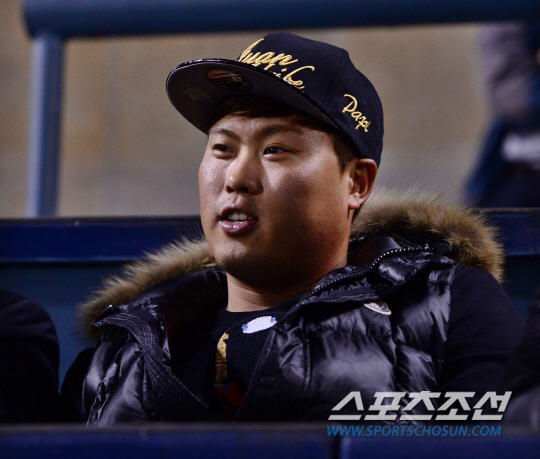 24일 잠실구장에서 2014프로야구 준PO 3차전 LG 트윈스와 NC 다이노스의 경기가 열렸다. LG가 마산 원정 1, 2차전을 승리하며 PO 진출에 1승 만을 남겨놓고 있다. 잠실 야구장을 찾은 류현진이 경기를 지켜보고 있다. 잠실=김경민 기자 kuyngmin@sportschosun.com / 2014.10.24.