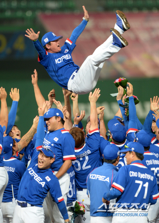 2014 인천 아시안게임 야구 결승전 한국과 대만의 경기가 28일 인천 문학구장에서 열렸다. 한국이 대만을 6-3으로 누르고 금메달을 획득했다. 이어 진행된 시상식에서 류중일 감독이 선수들에 행가레를 받고 있다. 인천=허상욱 기자 wook@sportschosun.com/2014.09.28/ |
