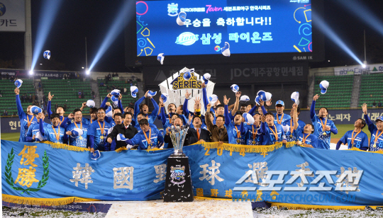 2014 프로야구 한국시리즈 6차전 삼성라이온즈와 넥센히어로즈의 경기가 11일 잠실야구장에서 열렸다. 4년연속 한국시리즈 우승을 차지한 류중일 감독과 삼성선수들이 트로피를 들고 환호하고 있다. 잠실=최문영 기자 deer@sportschosun.com /2014.11.11/ |