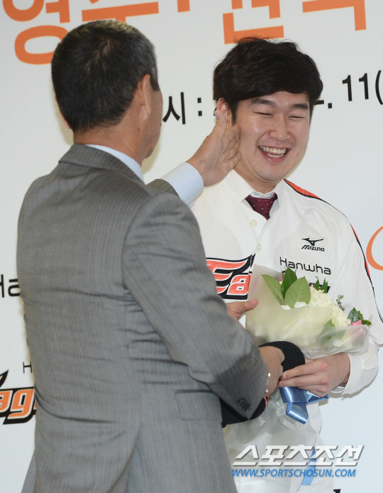 한화로 이적한 배영수, 권혁, 송은범의 입단식이 11일 대전 한화갤러리아타임월드 스카이홀에서 열렸다. 김성근 감독이 송은범에게 축하 꽃다발을 전달하며 뺨을 살짝 때리고 있다. 한화는 FA 투수 배영수와 3년간 총액 21억 5천만원, 송은범과 4년간 총액 34억원, 권혁과 4년간 총액 32억원에 계약을 체결했다. 대전=정재근 기자 cjg@sportschosun.com/2014.12.11/ |