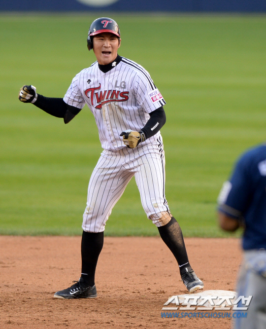 LG와 NC의 2014 프로야구 준플레이오프 4차전 경기가 25일 잠실구장에서 열렸다. 7회말 무사 만루 LG 오지환이 2타점 2루타를 치고 환호하고 있다. 잠실=허상욱 기자 wook@sportschosun.com/2014.10.25/