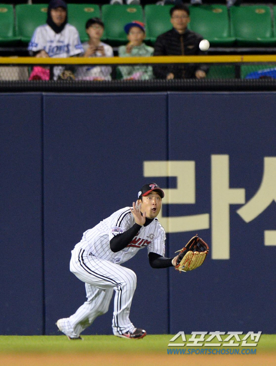 LG와 삼성의 2014 프로야구 경기가 7일 잠실구장에서 열렸다. 3회초 2사 1,2루 LG 좌익수 정의윤이 삼성 채태인의 플라이 타구를 몸을 날려 잡아내고 있다. 잠실=허상욱 기자 wook@sportschosun.com/2014.10.07/