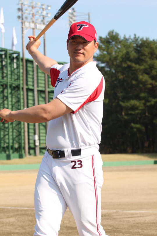 | 미야자키 마무리캠프에서 훈련 도중 포즈를 취한 최희섭. 사진제공=KIA 타이거즈 |