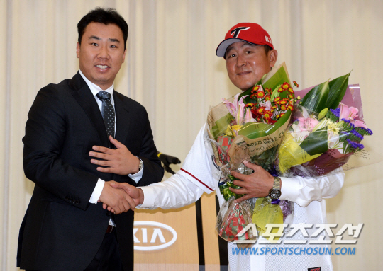 KIA 타이거즈 김기태 신임 감독이 취임식을 가졌다. 30일 광주 내방동 KIA 자동차 광주1공장 연구소 강당에서 열린 KIA 김기태 감독 취임식에서 김 감독이 주장 이범호로부터 꽃다발을 받고 있다. 김기태 감독은 지난달 28일 KIA 사령탑에 선임됐으나 코칭스태프 선임과 마무리 캠프 합류 등을 이유로 취임식을 미뤘다. KIA는 지난 10월 29일 일본 미야자키 휴가에 마무리 캠프를 차렸고, 김 감독은 11월 2일 캠프에 합류해 선수들을 이끌었다. 광주=허상욱 기자 wook@sportschosun.com/2014.11.30/ |