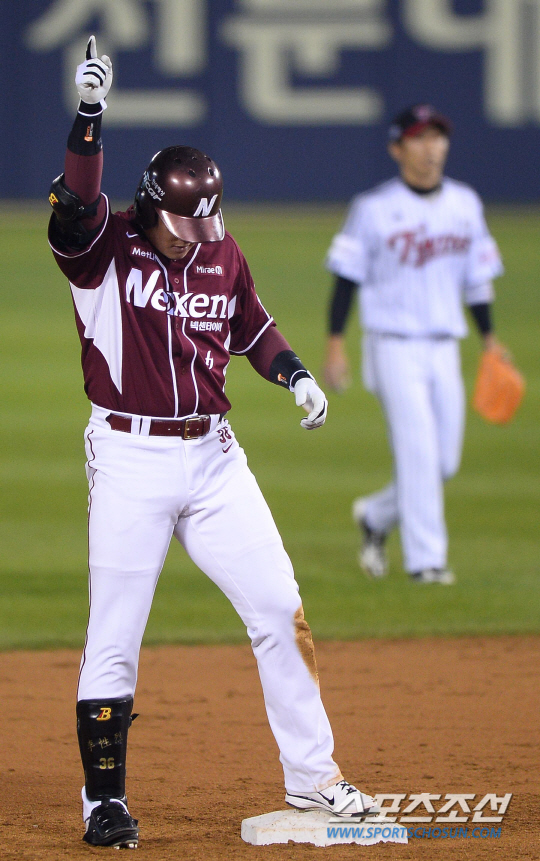 30일 잠실구장에서 2014 프로야구 플레이오프 3차전 LG 트윈스와 넥센 히어로즈의 경기가 열렸다. LG-넥센은 시리즈 1승 1패를 기록 중이다. LG 리오단과 넥센 오재영이 선발 맞대결을 펼쳤다. 넥센 5회 무사 1,2루에서 이성열이 1타점 2루타를 날렸다. 2루에서 손을 들어보이고 있는 이성열. 잠실=송정헌 기자 songs@sportschosun.com/2014.10.30