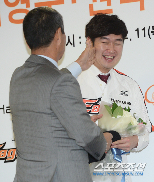한화로 이적한 배영수, 권혁, 송은범의 입단식이 11일 대전 한화갤러리아타임월드 스카이홀에서 열렸다. 김성근 감독이 송은범에게 축하 꽃다발을 전달하며 뺨을 살짝 때리고 있다. 김 감독은 기자회견에서 "송은범의 뺨을 살짝 때린 건 애정표시가 아니라, 헤매고 있어서 정신 차리라는 의미"라고 말했다. 한화는 FA 투수 배영수와 3년간 총액 21억 5천만원, 송은범과 4년간 총액 34억원, 권혁과 4년간 총액 32억원에 계약을 체결했다. 대전=정재근 기자 cjg@sportschosun.com/2014.12.11/