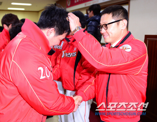 | 5일 인천 문학구장에서 프로야구 SK와이번스 시무식이 열렸다. SK 박경완 육성총괄이 최정(왼쪽)과 장난스럽게 인사를 나누고 있다. 인천=송정헌 기자 songs@sportschosun.com/2015.01.05 |