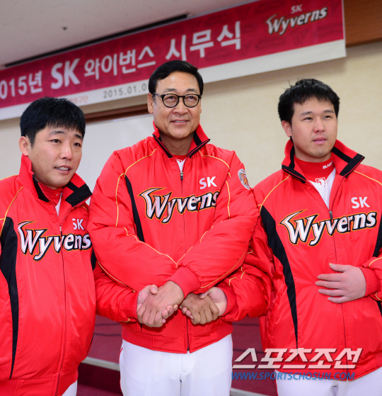 | 5일 인천 문학구장에서 프로야구 SK와이번스 시무식이 열렸다. SK 김용희 감독이 선수대표 조동화, 최정(오른쪽)과 함께 기념 포즈를 취하고 있다. 인천=송정헌 기자 songs@sportschosun.com/2015.01.05 |
