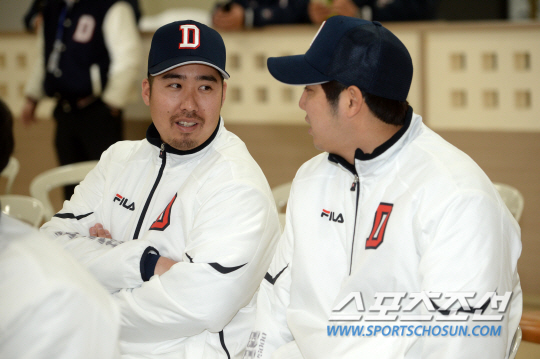 | 두산 베어스가 8일 잠실구장에서 2015년 시무식을 가졌다. 시무식에 참석한 유희관과 장원준이 이야기를 나누고 있다. 잠실=허상욱 기자 wook@sportschosun.com/2015.01.08/ |