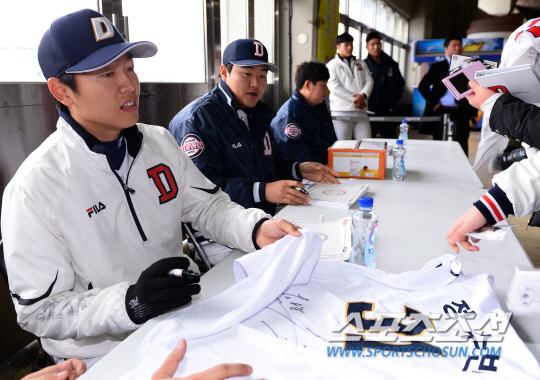 11월 30일 두산 베어스가 30일 잠실구장에서 팬과 선수들이 함께 만나는 '2014 곰들의 모임' 환담회를 실시했다. 두산 베어스의 이번 행사는 올시즌 보내준 팬들의 아낌없는 사랑에 보답하고 그 사랑을 주위의 소외받은 이웃들과 함께 나눈다는 취지에서 마련했다. 자선 경매를 비롯해 팬과 선수단이 함께 할 수 있는 다양한 이벤트를 마련했다. 팬들에게 사인을 해주고 있는 두산 선수단. 두산 정수빈이 팬들에게 사인을 해주고 있다. 잠실=송정헌 기자 songs@sportschosun.com/2014.11.30
