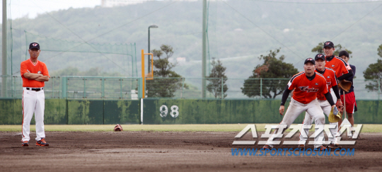 | ◇한화 이글스가 2015 스프링캠프 참가명단과 일정을 발표했다. 김성근 감독을 비롯한 코칭스태프 23명과 선수단 58명 등 총 81명이 15일부터 3월3일까지 일본 고치와 오키나와에서 캠프를 치른다. 사진은 지난해 11월 일본 오키나와 마무리캠프 때 수비 훈련을 하는 한화 내야진과 이를 지켜보는 김성근 감독. 사진=한화 이글스 제공 |