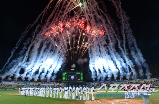 2014 프로야구 한국시리즈 1차전 삼성라이온즈와 넥센히어로즈의 경기가 4일 대구시민운동장에서 열렸다. 구본능 KBO총재의 개회선언과 더불어 개막축포가 울려퍼지고 있다. 대구=최문영 기자 deer@sportschosun.com /2014.11.04/