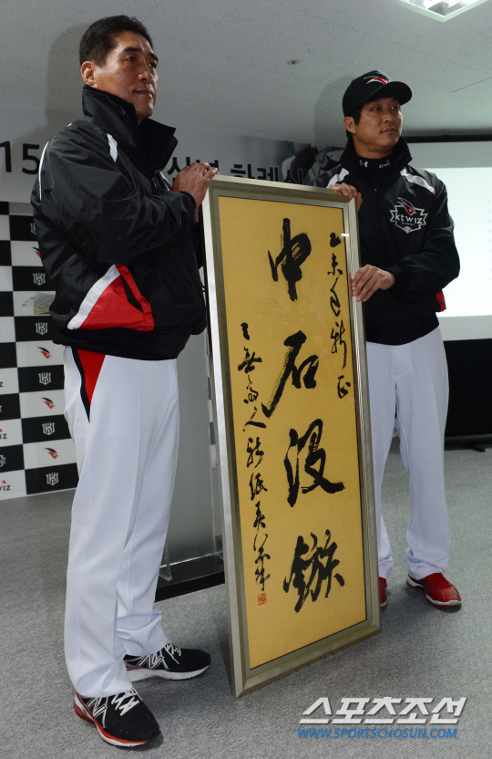 KT위즈가 14일 수원 KT위즈 파크에서 2015년 신년 하례식을 가졌다. 조범현 감독이 주장 신명철에게 '중석몰촉(돌 가운데 화살촉이 박힌 것을 비유한 사자성어로, 온힘을 다해 일을 추진하면 놀라운 결과를 거둘 수 있다는 뜻)'이 적힌 액자를 들고 포즈를 취하고 있다. 수원=허상욱 기자 wook@sportschosun.com/2015.01.14/