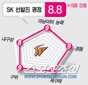 SK가 간발의 차로 1위에 올랐다. 현 시점에서는 그랬다. 5개 항목에서 총 44점을 얻었다. 이유가 있다. 1~3선발이 10개 구단 중 가장 좋다.