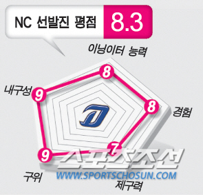 <300자 평>=1~3선발은 훌륭하다. NC 다이노스의 창단 때부터 함께 한 찰리와 에릭은 이미 검증된 외국인 투수들. 여기에 지난 시즌 주춤했던 토종 에이스 이재학이 절치부심중이다. 세 명 모두 이닝소화력이 뛰어나다는 게 NC의 강점이다. 하지만 원투스리 펀치 이후엔 급격히 기대치가 떨어진다. 지난 2년간 이재학 외에 토종 선발투수들을 발굴하지 못했다. 창단 첫 우선지명 듀오인 노성호와 이민호가 잠재력을 폭발시켜야 한다. 나란히 150㎞에 이르는 강속구를 뿌리는 좌완, 우완투수로 이들이 제구력이나 경험의 문제에서 벗어난다면, 강력한 선발진을 구축할 수 있다. 베테랑 손민한도 예비 선발로 준비한다.