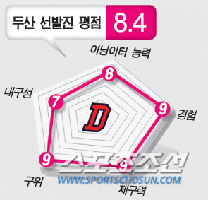 <300자 평>=FA 장원준의 영입으로 선발진이 탄탄해졌다. 최근 2년간 선발 로테이션이 무너졌던 두산 입장에서는 천군만마다. 니퍼트는 검증된 최고수준 외국인 선수. 장원준과 유희관도 좋은 제구력을 바탕으로 10승은 충분하다. 마야는 약간 불투명하지만, 지난 시즌 막판 강력한 경기력을 보였다. 4명의 선발은 이변이 없는 한 이닝이터로 꾸준한 역할을 할 수 있다. 우-좌-우-좌로 이어지는 형태도 이상적. 문제는 5선발이다. 현 시점에서 이현승이 가장 강력한 후보. 노경은이 있지만, 마땅한 마무리감이 없어 보직이 변경될 수 있다. 이현승이 제 역할을 못하거나, 선발 1명의 부상으로 빠지면 대체카드가 부족한 점도 걸리는 부분.