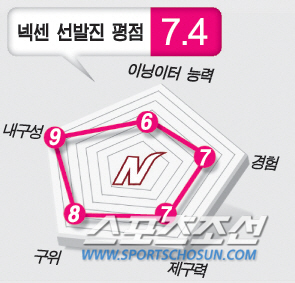 올해 외국인 투수를 3명에서 2명으로 써야하는 NC가 41점으로 4위에 올랐다. 찰리와 에릭, 그리고 이재학으로 이어지는 탄탄한 1~3선발 때문이다. 하지만 4, 5선발이 검증되지 않았다는 약점이 있다. 잠재력 넘치는 카드(노성호 이민호)와 베테랑 손민한이 있지만, 선발로 풀타임을 효율적으로 소화할 수 있을 지는 의문이다. 기본적으로 SK, 삼성, 두산, NC는 싸워볼 만한 선발진을 갖추고 있다. 4강이다.
