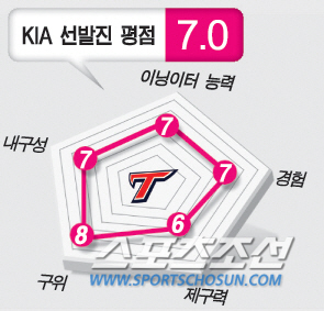 KIA가 7위(35점)다. 해외진출을 시도하던 양현종이 팀에 잔류한 것은 천군만마. 하지만 검증되지 않은 두 외국인 투수와 4, 5선발 임준섭, 김병현에게 믿음을 주기 어렵다. 김진우도 유력한 선발 후보였으나 전지훈련 명단에 빠져 불투명해졌다. 결국 선발진 자체에 불안요소들이 많다. LG, 넥센, KIA는 불안요소도 많지만, 싸워볼 만한 선발진이다. 3중이다.