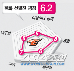 <300자 평>=이름만 놓고 보면 어디에 내놔도 손색이 없다. 하지만 실전에서 어떤 활약을 할 지는 짐작하기 어렵다. 불안 요소가 너무 많기 때문. 일단 롯데에서 3년 연속(2012~2014) 10승 이상을 달성했던 외국인 선수 유먼은 믿을만 하다. 하지만 나머지 선발들에게는 모두 물음표가 달려있다. 2012년 삼성에서 14승을 했던 탈보트는 3년만에 복귀라 구위가 전만 못하다. 또 배영수는 2012년 이후 계속 구위와 스태미너가 하락하고 있다. 송은범은 부상 후유증을 극복하는 게 급선무. 이태양과 유창식도 구위와 제구력의 기복이 심하고, 몸상태도 완전치 못하다. 현재로서는 경쟁력이 약한 선발진이다.