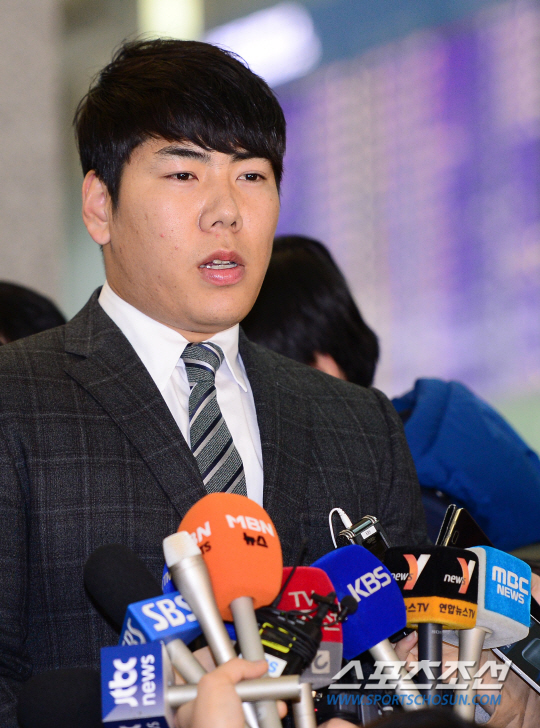 미국 메이저리그 피츠버그 파이리츠와 입단 협상 중인 넥센 강정호가 14일 오전 인천공항을 통해 미국으로 출국했다. 강정호는 13일 미국 스포츠전문채널 ESPN으로부터 "피츠버그가 강정호와 4년 1600만달러 계약에 합의했다. 5년째는 1년짜리 옵션까지 걸려 있는 계약"이라고 보도해 메이저리그 입단 가능성을 키웠다. 출국에 앞서 인터뷰에 응하고 있는 강정호. 인천=송정헌 기자 songs@sportschosun.com/2015.01.14