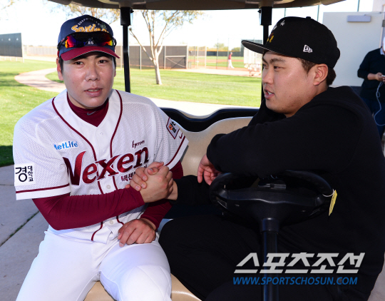한국의 두 메이저리거가 만났다. 피츠버그에 입단한 강정호가 절친 류현진과 만났다. 류현진은 강정호가 넥센 선수들과 함께 훈련에 임하고 있는 애리조나 서프라이즈 훈련장을 찾아 친구와 반가운 만남을 가졌다. 류현진은 애리조나에서 개인 훈련을 하고 있었다. 강정호의 훈련이 끝나길 기다린 류현진이 강정호와 반갑게 만나 포즈를 취하고 있다. 서프라이즈(미국 애리조나)송정헌 기자 songs@sportschosun.com/2015.01.18