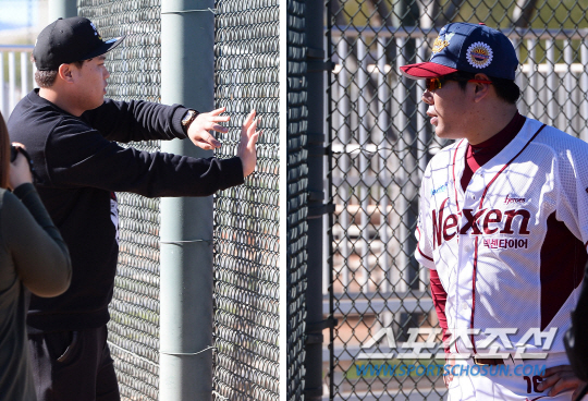 한국의 두 메이저리거가 만났다. 피츠버그에 입단한 강정호가 절친 류현진과 만났다. 류현진은 강정호가 넥센 선수들과 함께 훈련에 임하고 있는 애리조나 서프라이즈 훈련장을 찾아 친구와 반가운 만남을 가졌다. 류현진은 애리조나에서 개인 훈련을 하고 있었다. 강정호의 훈련이 끝나길 기다리는 류현진이 애타는 모습으로 철조망 넘어 강정호를 바라보고 있다. 서프라이즈(미국 애리조나)송정헌 기자 songs@sportschosun.com/2015.01.18