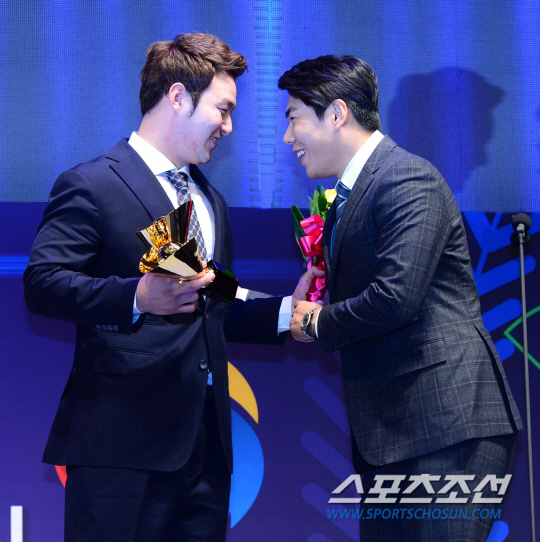 18일 오후 서울 양재동 더케이 호텔에서 2014 프로야구 최우수선수(MVP)/ 최우수신인선수 선정 및 각 부문별 시상식이 열렸다. 최다홈런상과 최다타점상을 받은 넥센 박병호가 강정호에게서 트로피를 받아들고 있다. 김경민 기자 kyungmin@sportschosun.com / 2014.11.18. |