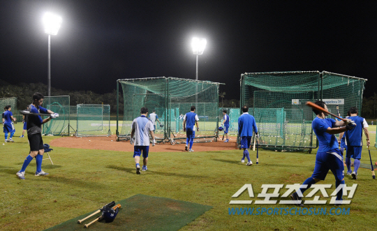 17일 밤 괌 레오팰리스 리조트 훈련장에서 삼성 선수들이 야간훈련을 했다. 야간 훈련은 저녁 7시부터 두 개조로 나눠 1시간씩 웨이트트레이닝과 타격훈련(야수), 웨이트트레이닝과 개인과제훈련(투수)으로 진행된다. 선수들이 타격훈련을 하고 있다. 괌=정재근 기자 cjg@sportschosun.com/2015.01.17/ |