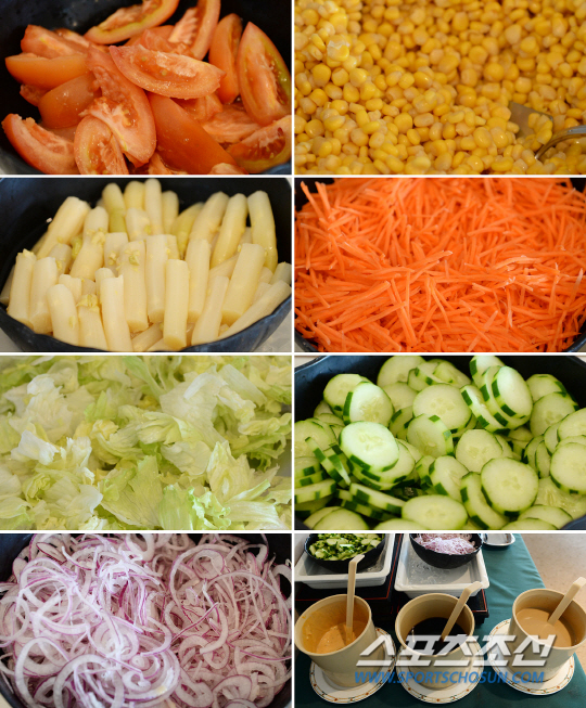 샐러드류. 토마토, 콘샐러드, 아스파라거스, 당근, 양상치, 오이, 적양파와 세 종류의 드레싱이 더위에 지친 선수들의 입맛을 돋운다.