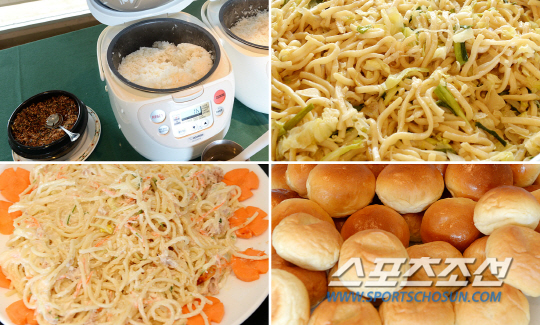 탄수화물류. 밥, 볶음우동, 스파게티, 빵 네 종류가 준비되어 있다. 각자 입맛에 맞게 고르면 된다.