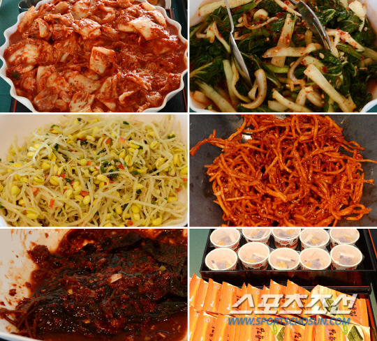 반찬류. 김치, 김치겆절이, 콩나물무침, 오징어채무침, 깻잎절임, 김, 나또가 준비되어 있다. 특히 깻잎절임이 인기가 많았다.