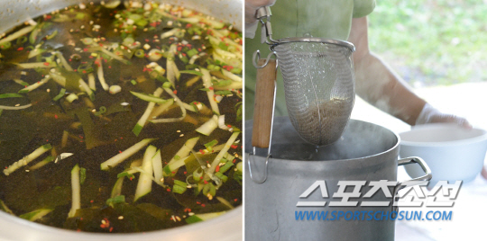 국물류. 이날 점심식사의 하이라이트는 미역오이냉국. 뜨거운 국수도 함께 준비됐다. 청국장, 된장국 등도 단골 메뉴다.