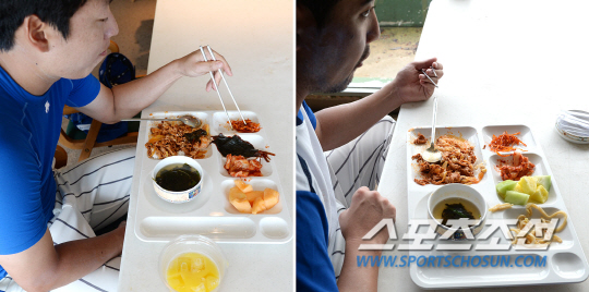 뜻밖에 빈약한 점심을 먹는 선수도 있었다. 박석민이다. 밥, 새우튀김 2조각, 잡채와 볶음우동 조금, 과일과 김치가 전부였다. 그 대신 아침저녁을 잘 먹는다고 했다.