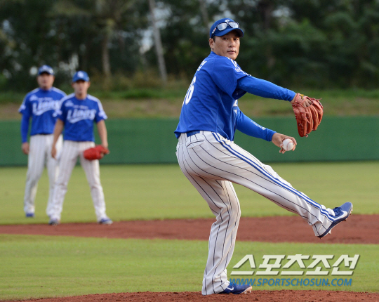 삼성 선수들이 괌 전훈 7일째 훈련을 했다. 22일 괌 레오팰리스 리조트 훈련장에서 이승엽이 마운드에 올라 투수 수비훈련을 하고 있다. 선수들의 컨디션을 고려해 오후 5시부터 시작된 훈련에서 야수들과 투수들이 서로 포지션을 바꿔 수비훈련을 했고, 외야수와 내야수도 서로 위치를 바꿔 수비훈련을 하는 이색 풍경이 벌어졌다.