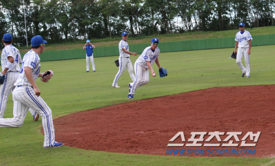 삼성 라이온즈 투수 안지만이 23일 괌 레오팔레스리조트 야구장에서 열린 스프링캠프서 야수로 변신했다. 이날 투수와 야수의 포지션을 바꿔 진행된 수비훈련에서 2루수 역할을 맡은 안지만이 1루로 뛰어들어오는 투수(?) 박해민에게 공을 토스하고 있다.