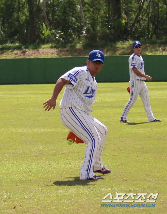 삼성 라이온즈 박석민이 23일 괌 레오팔레스리조트 야구장에서 열린 스프링캠프서 외야수로 변신해 '지옥'의 테니스공 훈련을 했다. 김평호 수비코치가 치는 테니스 공을 여러 동작을 이어서 하며 연달아 잡아내는 훈련으로 삼성 내야수들은 녹초가 됐다. 박석민이 테니스공이 몸 뒤쪽으로 날아오자 빠르게 글러브를 뒤로 빼 잡아내고 있다.