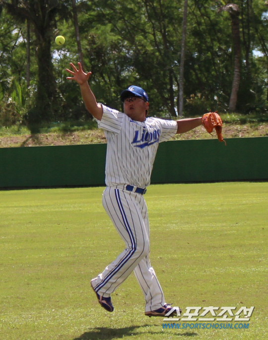 삼성 라이온즈 박석민이 23일 괌 레오팔레스리조트 야구장에서 열린 스프링캠프서 외야수로 변신해 '지옥'의 테니스공 훈련을 했다. 김평호 수비코치가 치는 테니스 공을 여러 동작을 이어서 하며 연달아 잡아내는 훈련으로 삼성 내야수들은 녹초가 됐다. 박석민이 테니스공이 몸 뒤쪽으로 날아오자 오른손을 뻗어 맨손으로 잡아내고 있다.