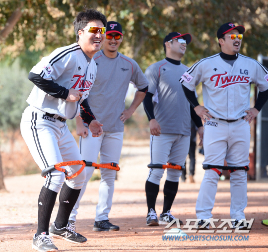 LG 트윈스가 미국 애리조나 피닉스의 글렌데일 다저스 스프링캠프장에서 전지훈련에 임했다. LG 선수들이 탄력밴드를 이용해 하체 강화 훈련을 하고 있다. 이진영이 동료들과 함께 훈련에 임하고 있다. 글렌데일(미국 애리조나) 송정헌 기자 songs@sportschosun.com/2015.01.21