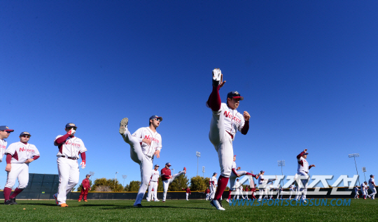 넥센 히어로즈 선수들이 2015 첫 전지훈련에 임했다. 염경엽 감독을 포함하여 총 68명으로 구성 된 선수단 및 프런트는 2월 18일까지 미국 애리조나 서프라이즈에서 1차 훈련을 실시한다. 넥센 선수들이 1차 캠프 첫 훈련에 임하고 있다. 힘찬 함성과 함께 몸을 풀고 있는 넥센 선수들. 서프라이즈(미국 애리조나)송정헌 기자 songs@sportschosun.com/2015.01.18 |